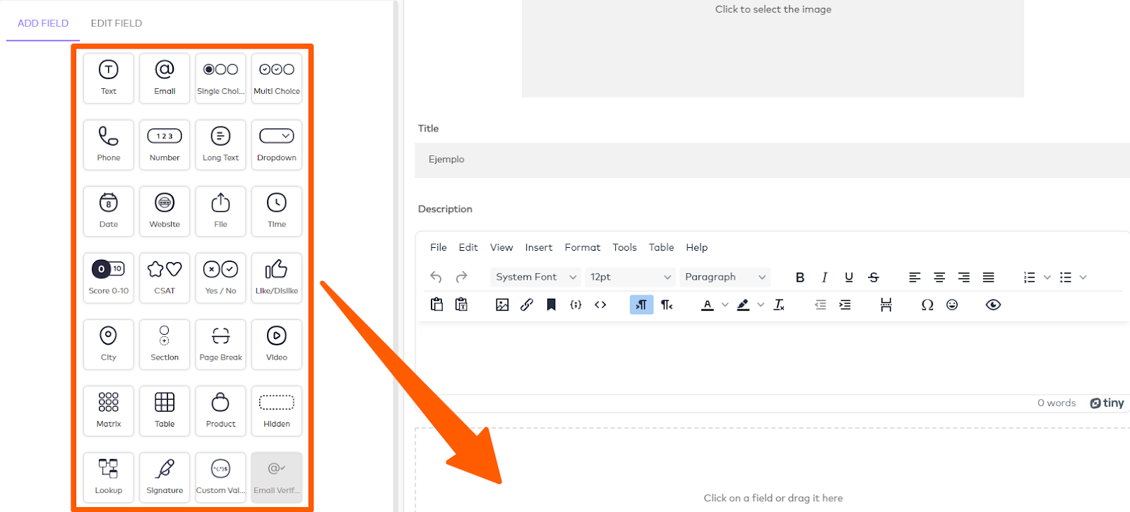 A mano izquierda verás los distintos tipos de ítems que puedes añadir. Puedes agregarlos clicando en ellos, o arrastrándolos al campo que mostramos en la siguiente imagen.